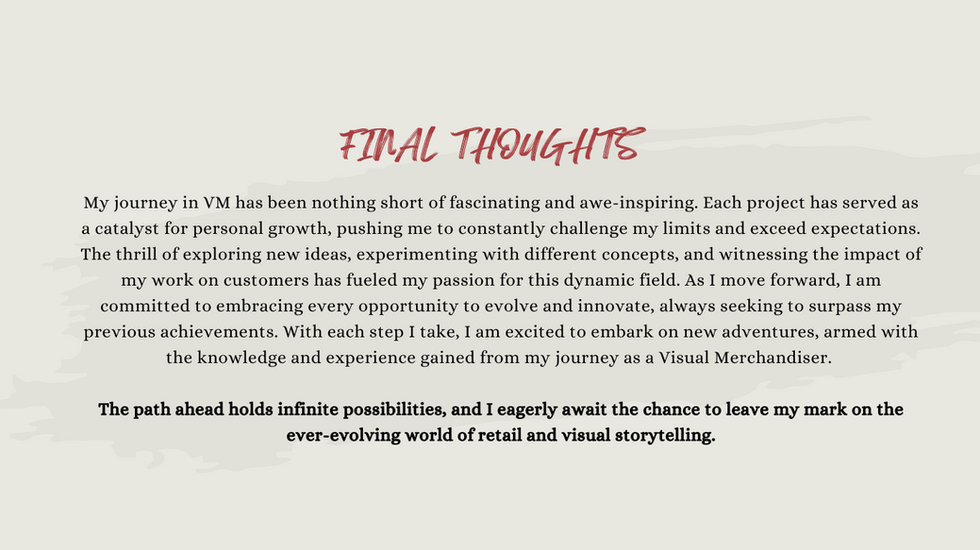 At AllSaints, I transitioned from stylist to Visual Merchandiser, where I was responsible for enhancing store layouts, styling mannequins, and creating engaging window displays, all in alignment with the brand’s visual guidelines. Each month, I worked on executing seasonal directives by conceptualizing and designing innovative presentations that elevated the customer experience and boosted sales. My role involved curating themed destinations, showcasing my ability to merge creativity with brand strategy to drive retail success.